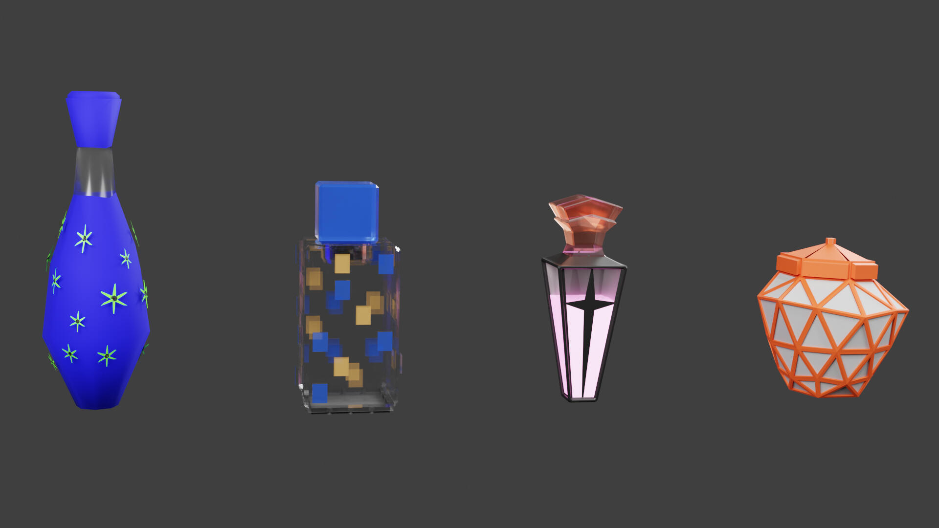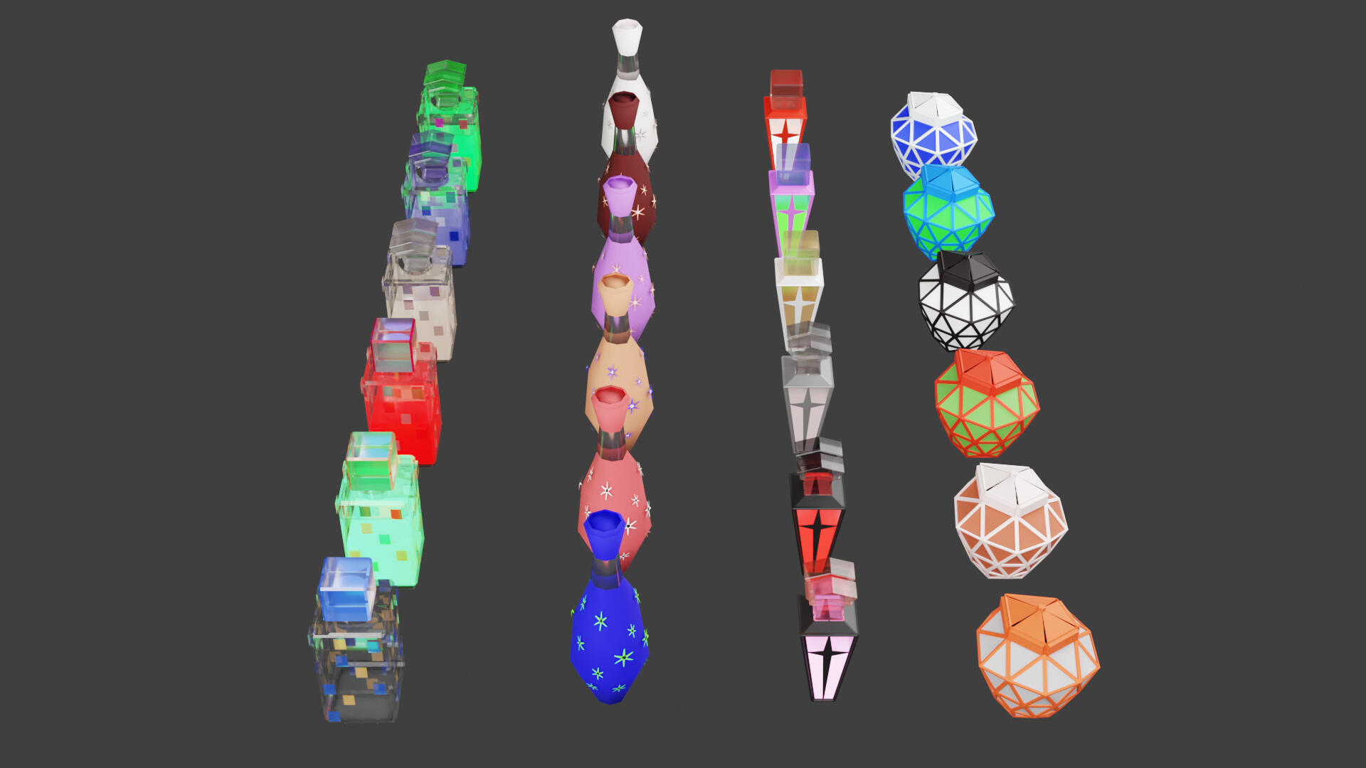A small fantasy bottles/vials pack built for quick variety via color/lid variations.