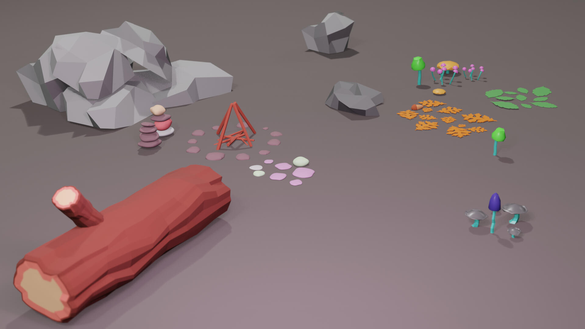 9 meshes (rocks/pebbles, log, branch, mushroom, leaf)