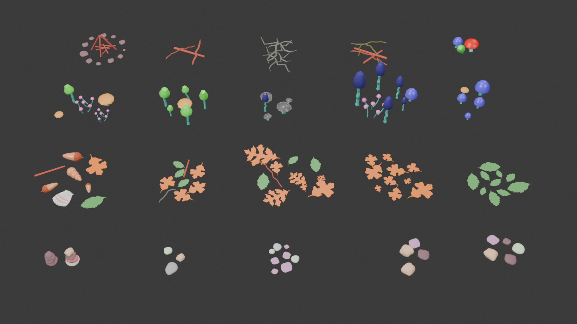 A curated set of core forest scatter meshes + a couple clusters for instant ground dressing tests.