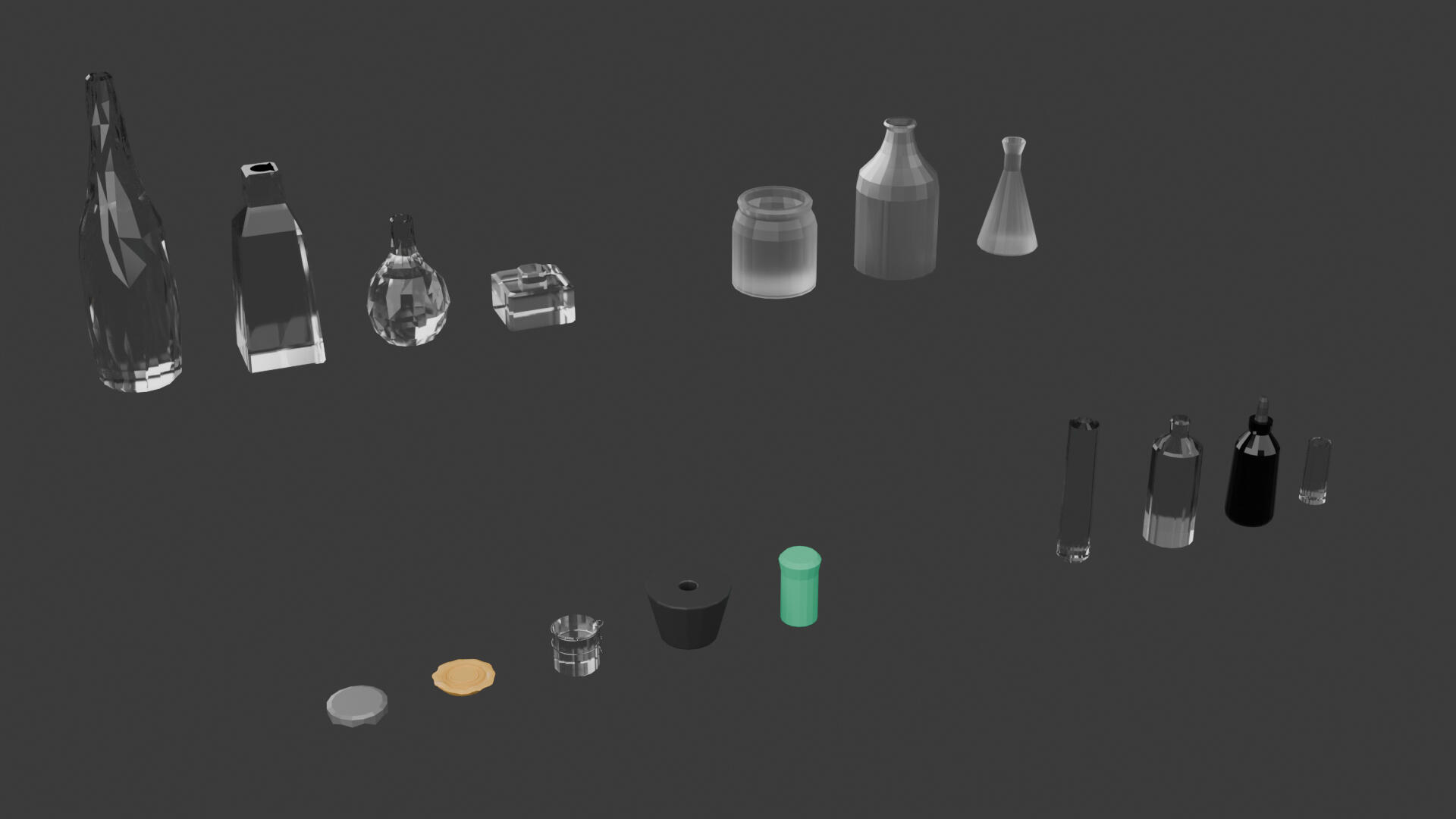 A small fantasy bottles/vials pack built for quick variety via color/lid variations.