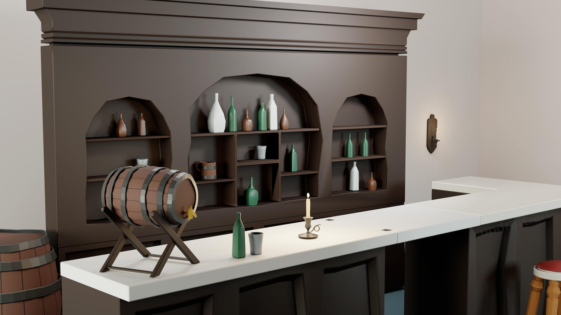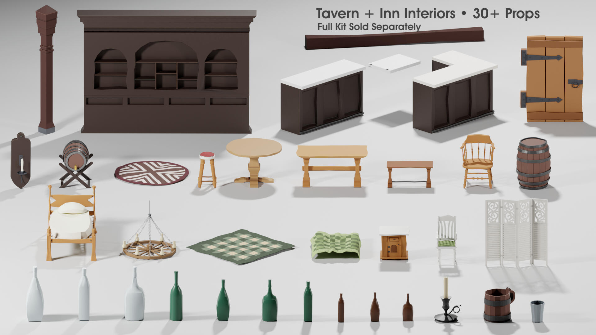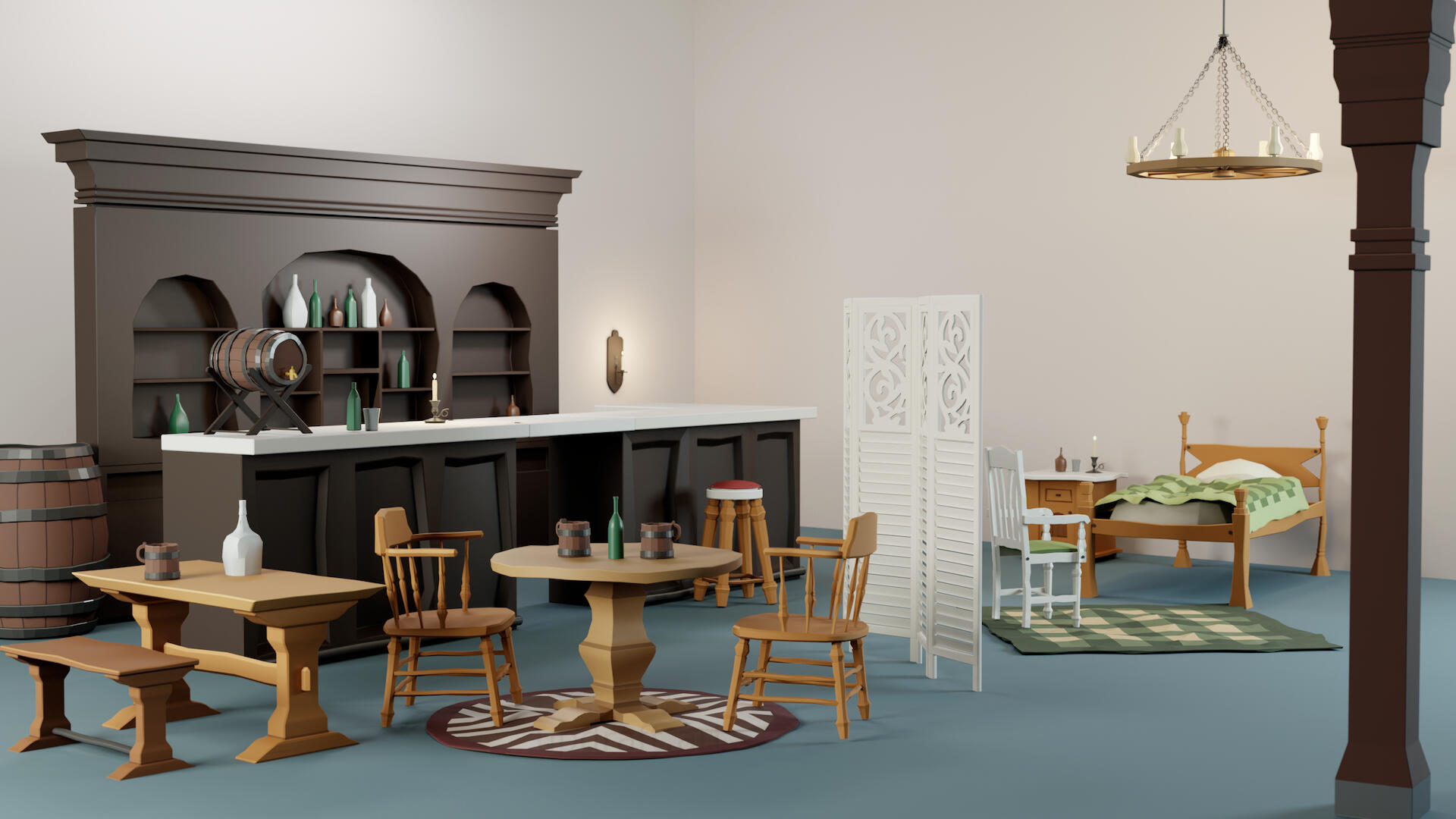 A compact tavern bar + inn bedroom prop set for building cozy fantasy interiors fast—consistent scale, clean silhouettes, and a simple material workflow.
