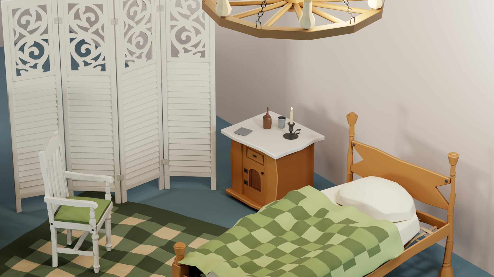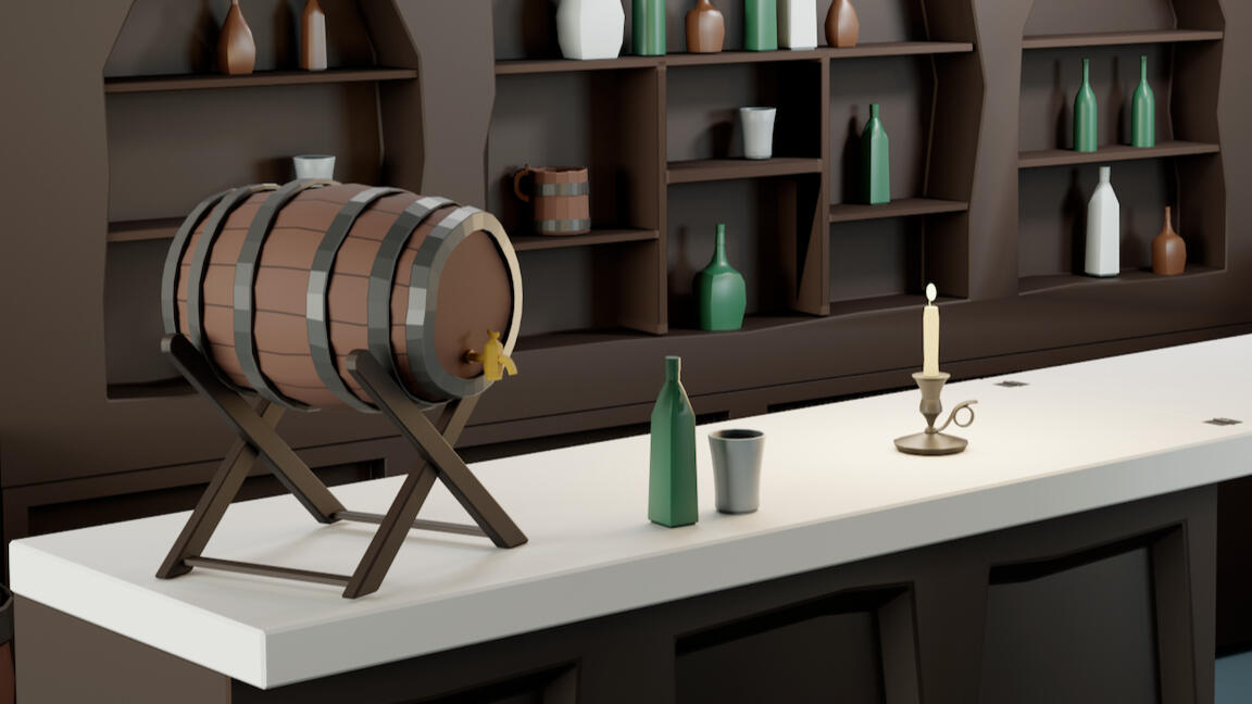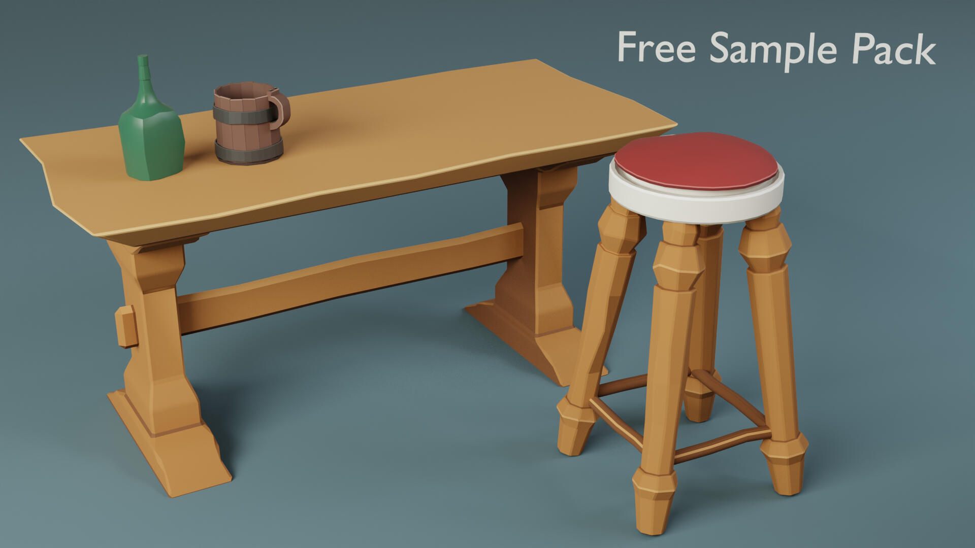 A compact tavern bar + inn bedroom prop set for building cozy fantasy interiors fast—consistent scale, clean silhouettes, and a simple material workflow.