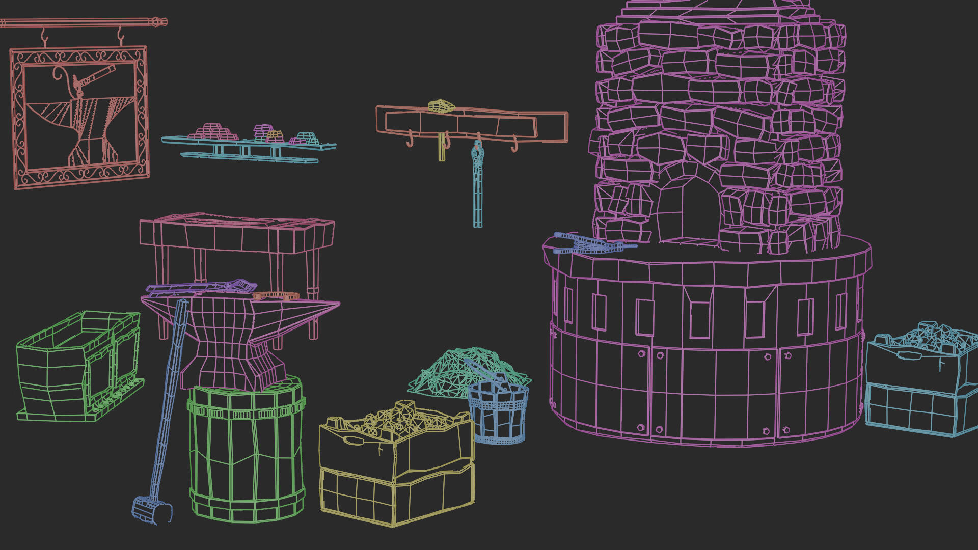 A compact blacksmith workshop kit for fast set dressing, built around a simple single-material workflow.