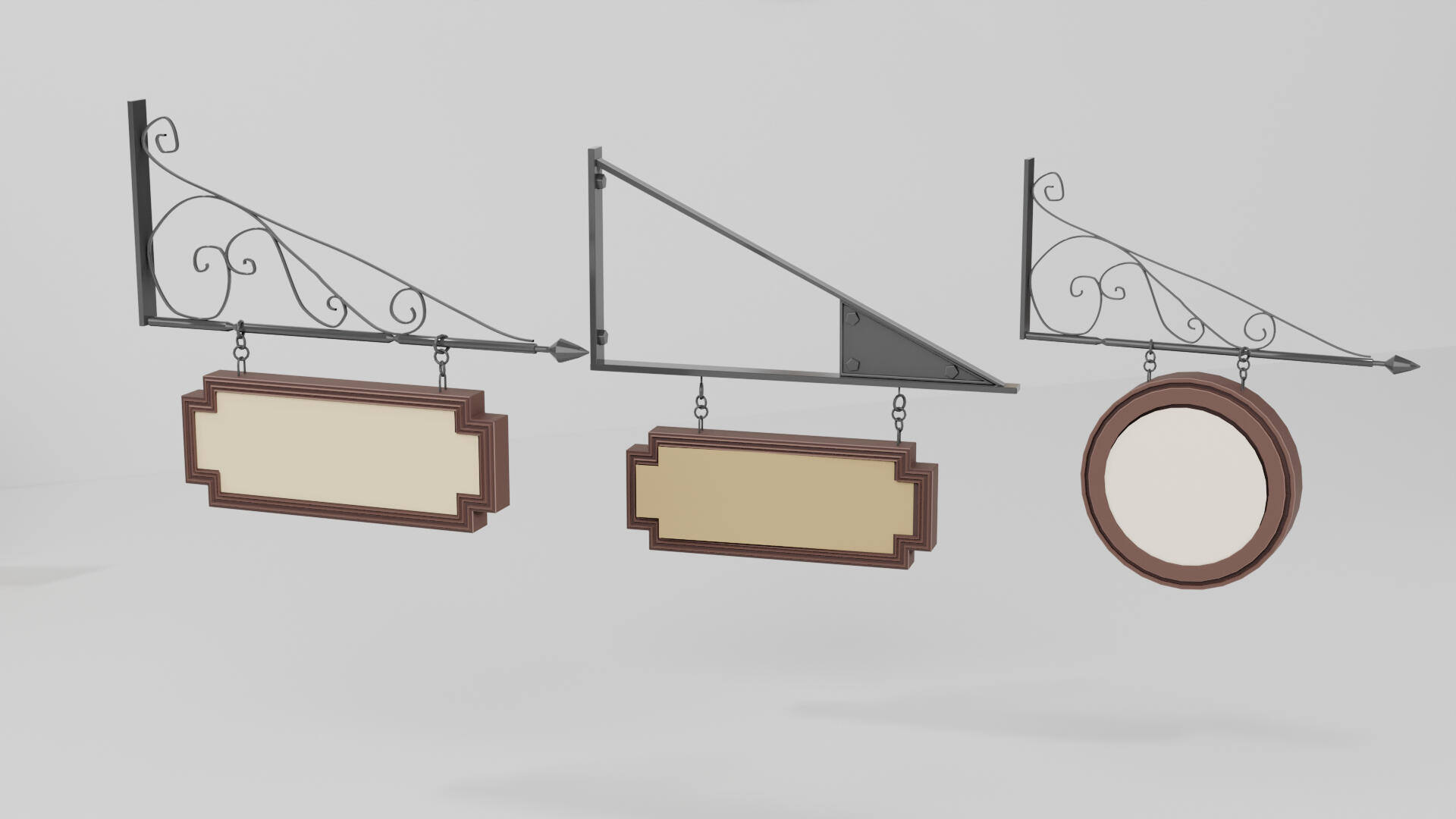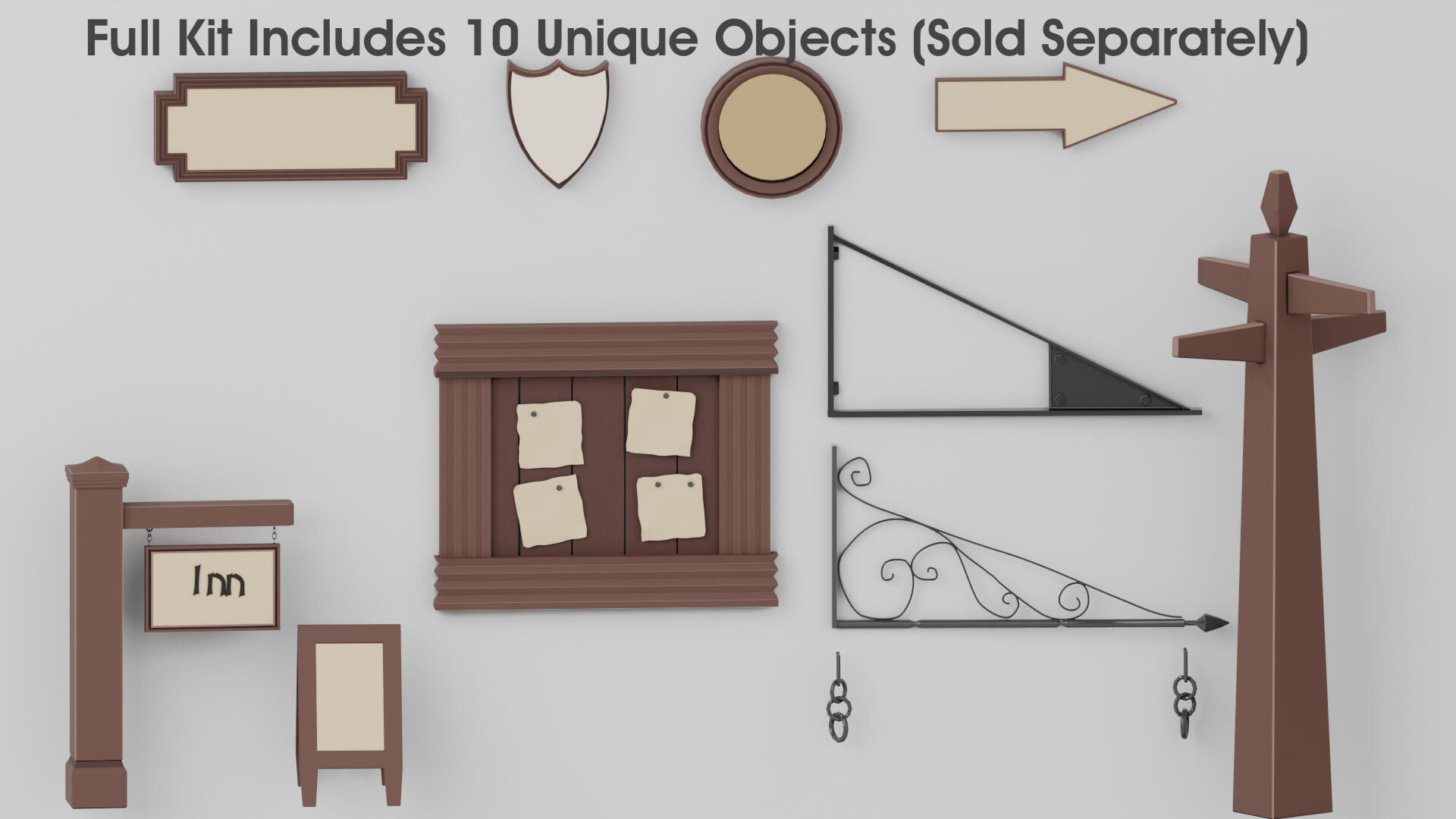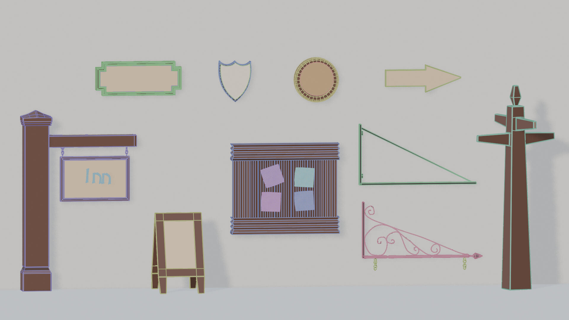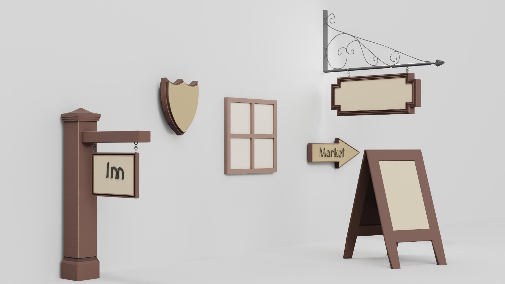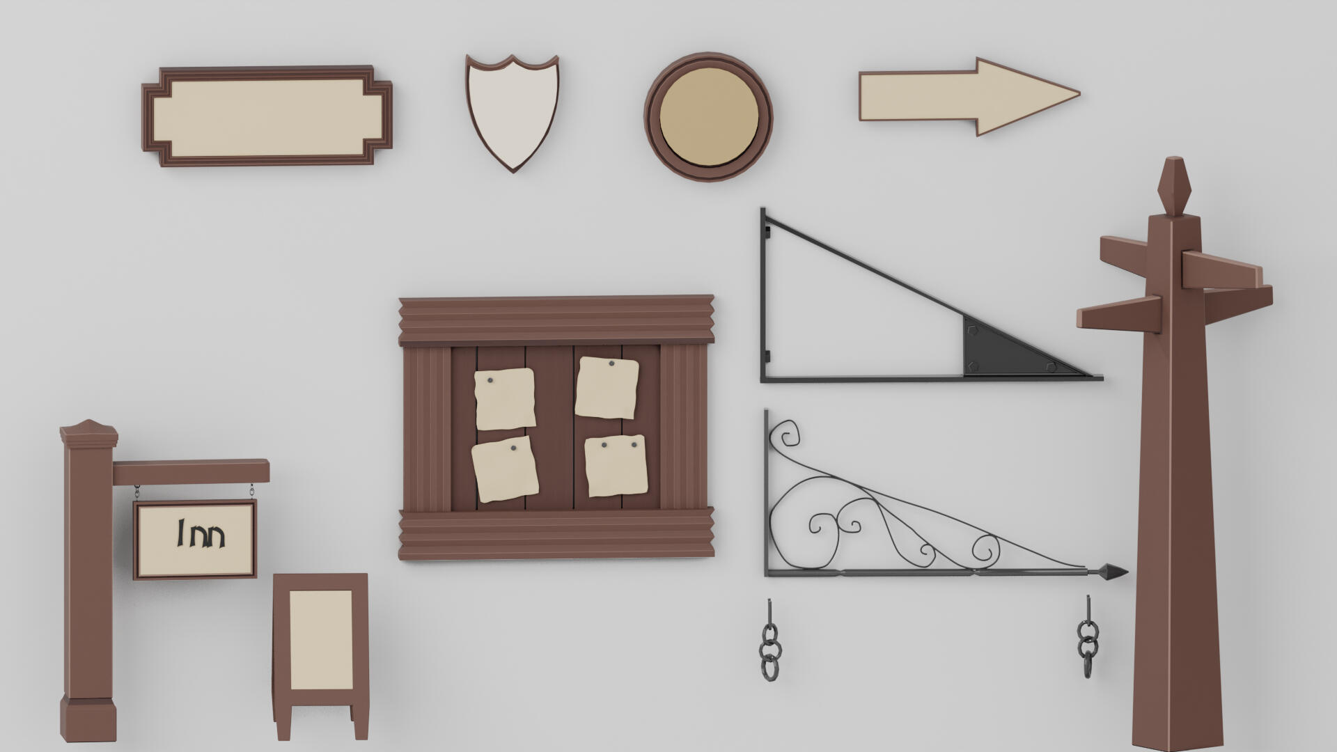 A compact medieval town signage set with customizable sign faces so you can label shops quickly.