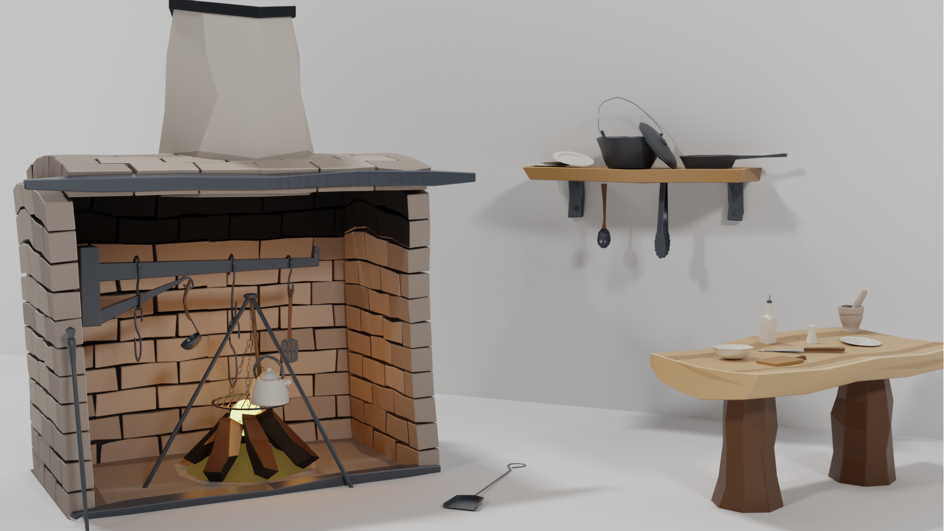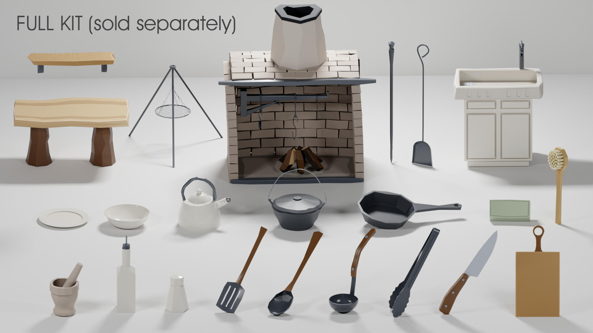 A cohesive stylized kitchen kit built around a functional hearth cooking corner for fast interior scene dressing.