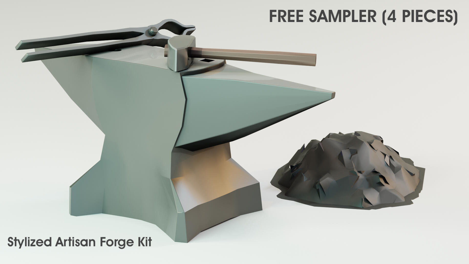 Test the Stylized Artisan Forge Kit for free. Get a 4-piece starter pack including anvil, small hammer, flat tongs, and coal pile. Enter your email to get the download link.
